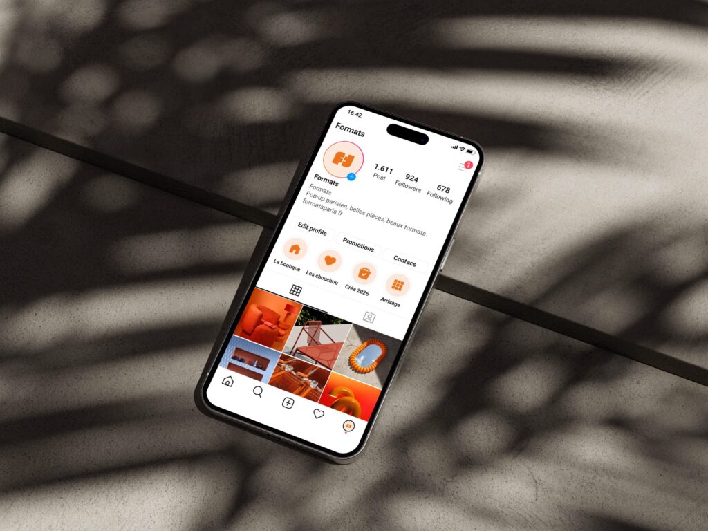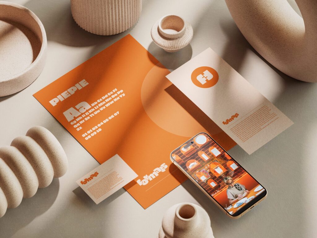 L’univers graphique s’appuie sur une couleur orange marquée et un jeu de répétition du signe, créant une identité visuelle rythmée et reconnaissable.