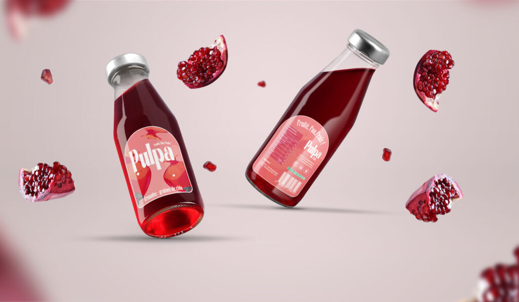 Pulpa illustre une boisson rafraîchissante à base de grenade et graines de chia. L’objectif : créer un visuel attrayant, coloré et dynamique, avec une typographie audacieuse et un univers fruité. Un design moderne pensé pour séduire une cible jeune et soucieuse de bien-être.
